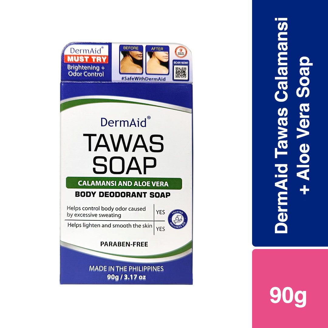 Dermaid Tawas Calamansi + Aloe Vera Soap 90g Dermaid Tawas Soap is enriched with Calamansi andAloe Vera that helps control excessive body sweat andhelps fight odor-causing bacteria.